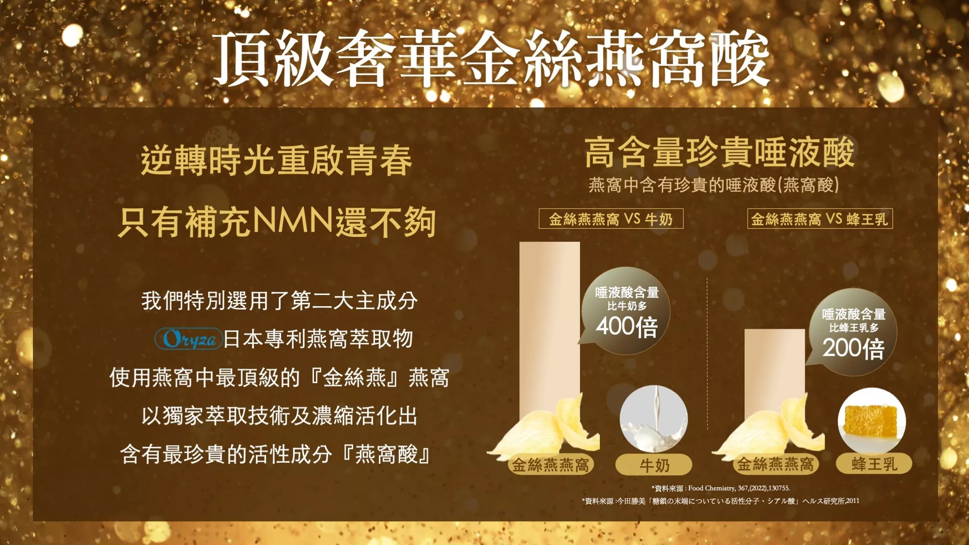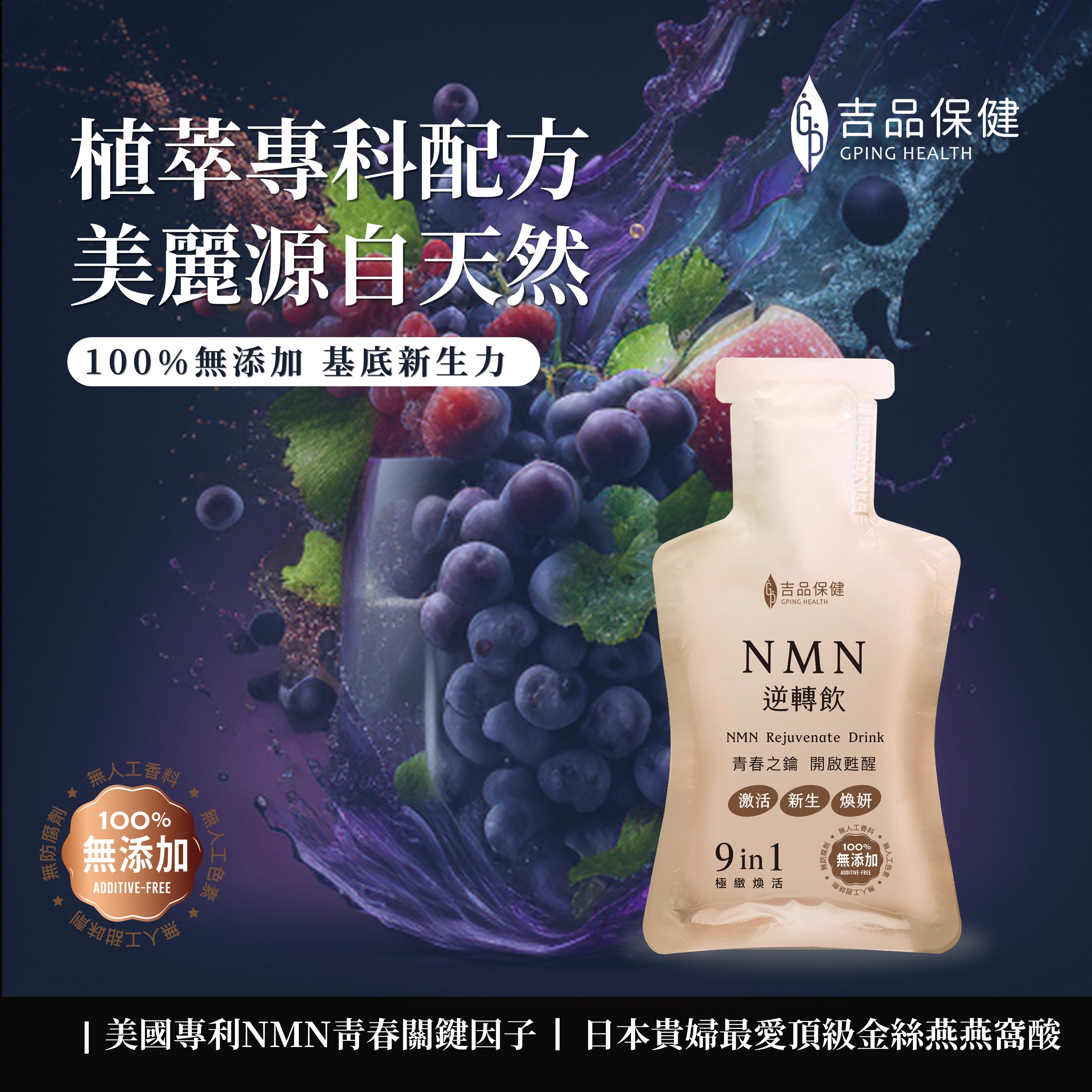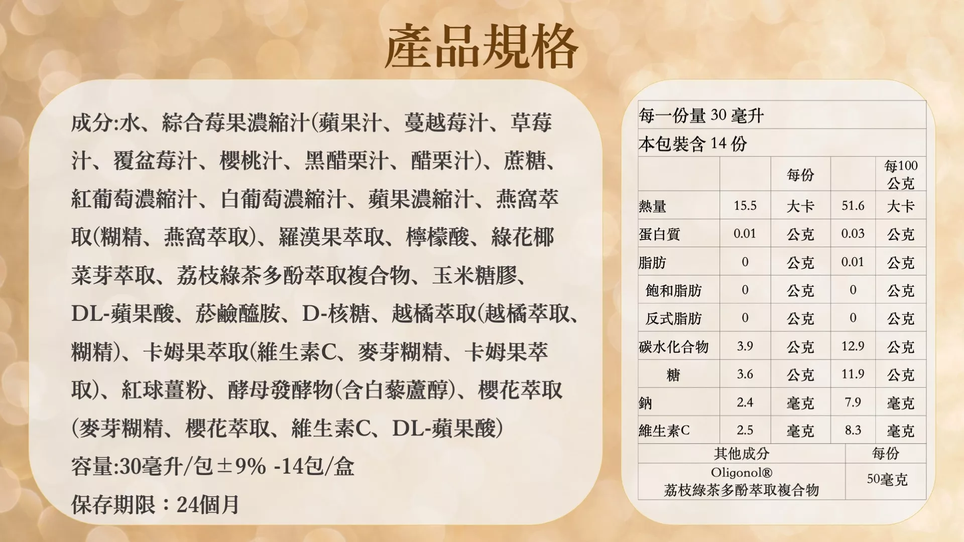 成分:水、綜合莓果濃縮汁(蘋果汁、蔓越莓汁、草莓汁、覆盆莓汁、櫻桃汁、黑醋栗汁、醋栗汁)、蔗糖、紅葡萄濃縮汁、白葡萄濃縮汁、蘋果濃縮汁、燕窩萃取(糊精、燕窩萃取)、羅漢果萃取、檸檬酸、綠花椰菜芽萃取、荔枝綠茶多酚萃取複合物、玉米糖膠、DL-蘋果酸、菸鹼醯胺、D-核糖、越橘萃取(越橘萃取、糊精)、卡姆果萃取(維生素C、麥芽糊精、卡姆果萃取)、紅球薑粉、酵母發酵物(含白藜蘆醇)、櫻花萃取(麥芽糊精、櫻花萃取、維生素C、DL-蘋果酸)