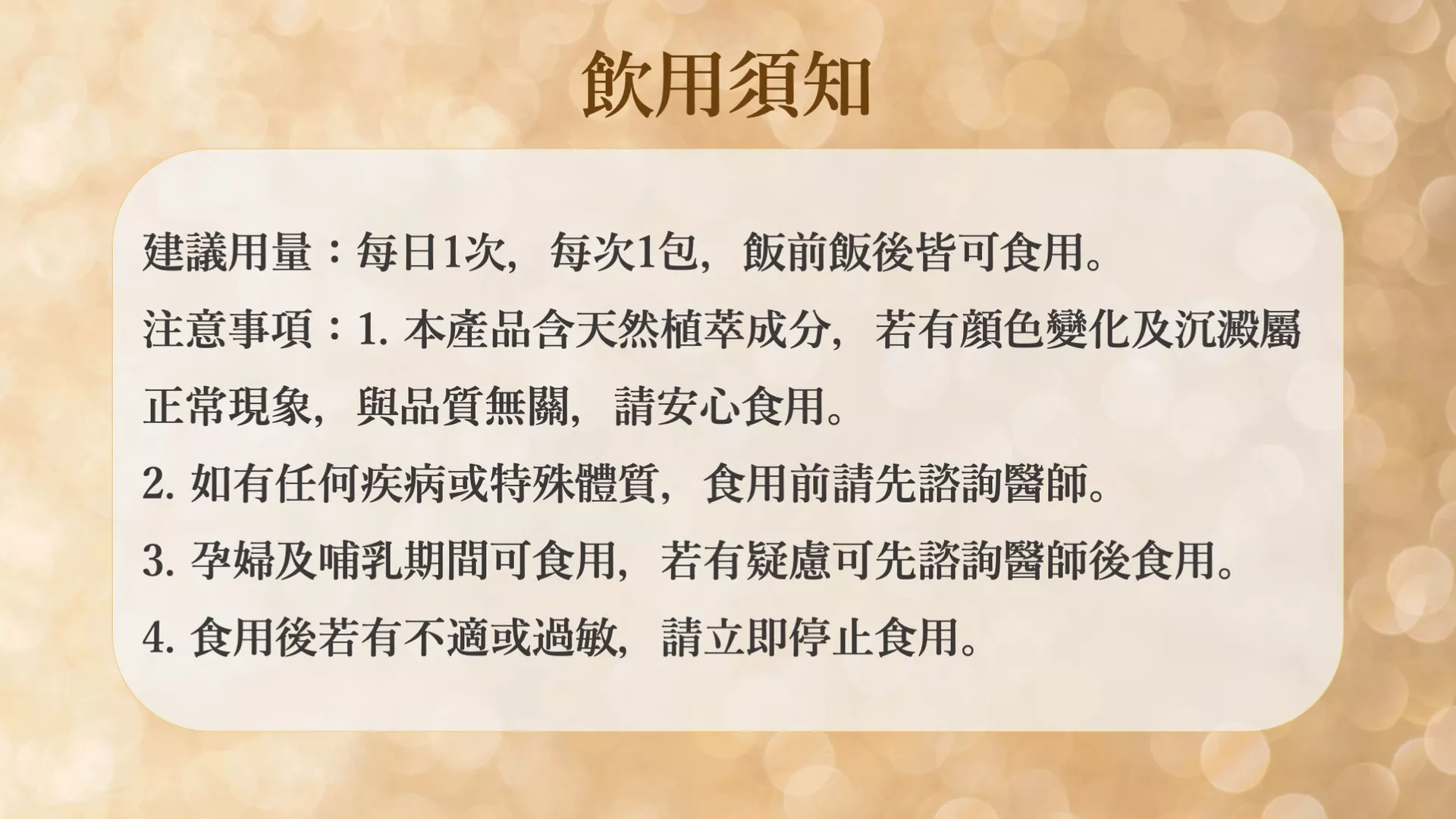 1.本產品含天然植萃成分,若有顔色變化及沉澱屬正常現象,與品質無關,請安心食用